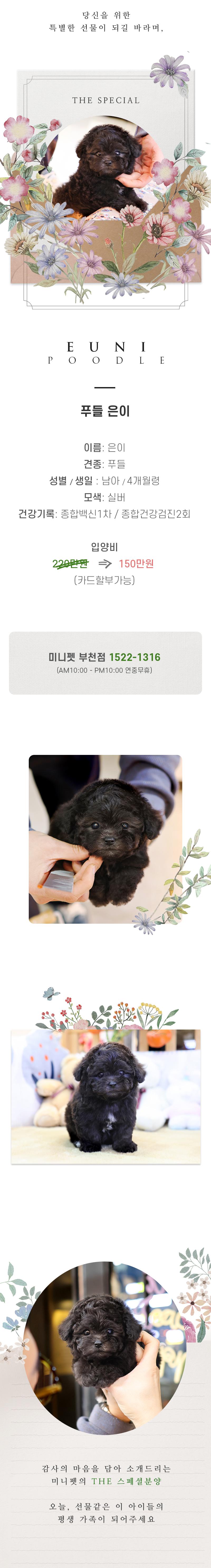 현 애완동물 피해보상 규정인 15일 아닌 1년(365일)동안 자견, 자묘의 건강을 연장 책임보장 하며, 질병발생시 병원에서 입원치료, 폐사시 업계최초로 동종교한 또는 환불을 보장합니다.